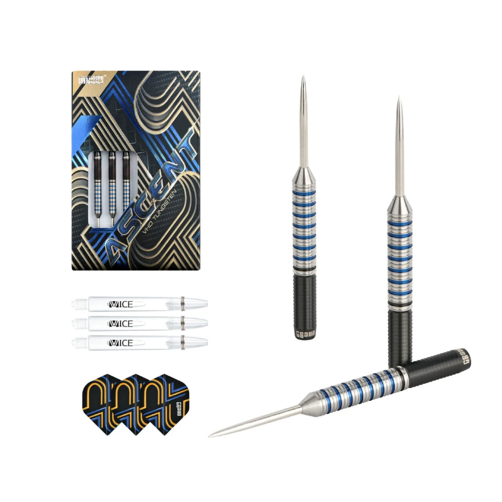 90 % Tungsten Barrel silber, blau, schwarz, Spitzen silber, Schäfte schwarz (Vice, 6 Stk.), Ascent Flights 6,5 mm x 51 mm (22 g), 6,9 mm x 51 mm (24 g) parallel mit Shark (hinteres Drittel) und Ringgrip (vorne)