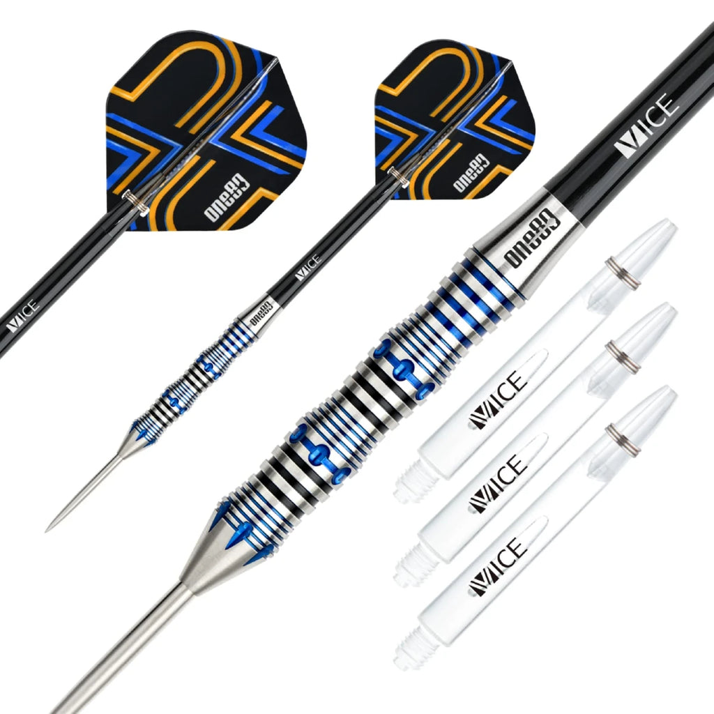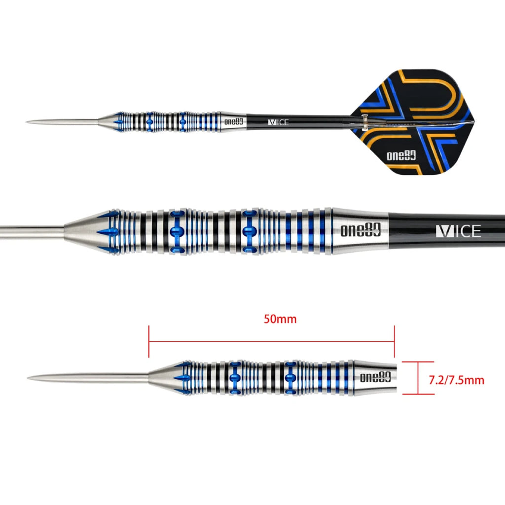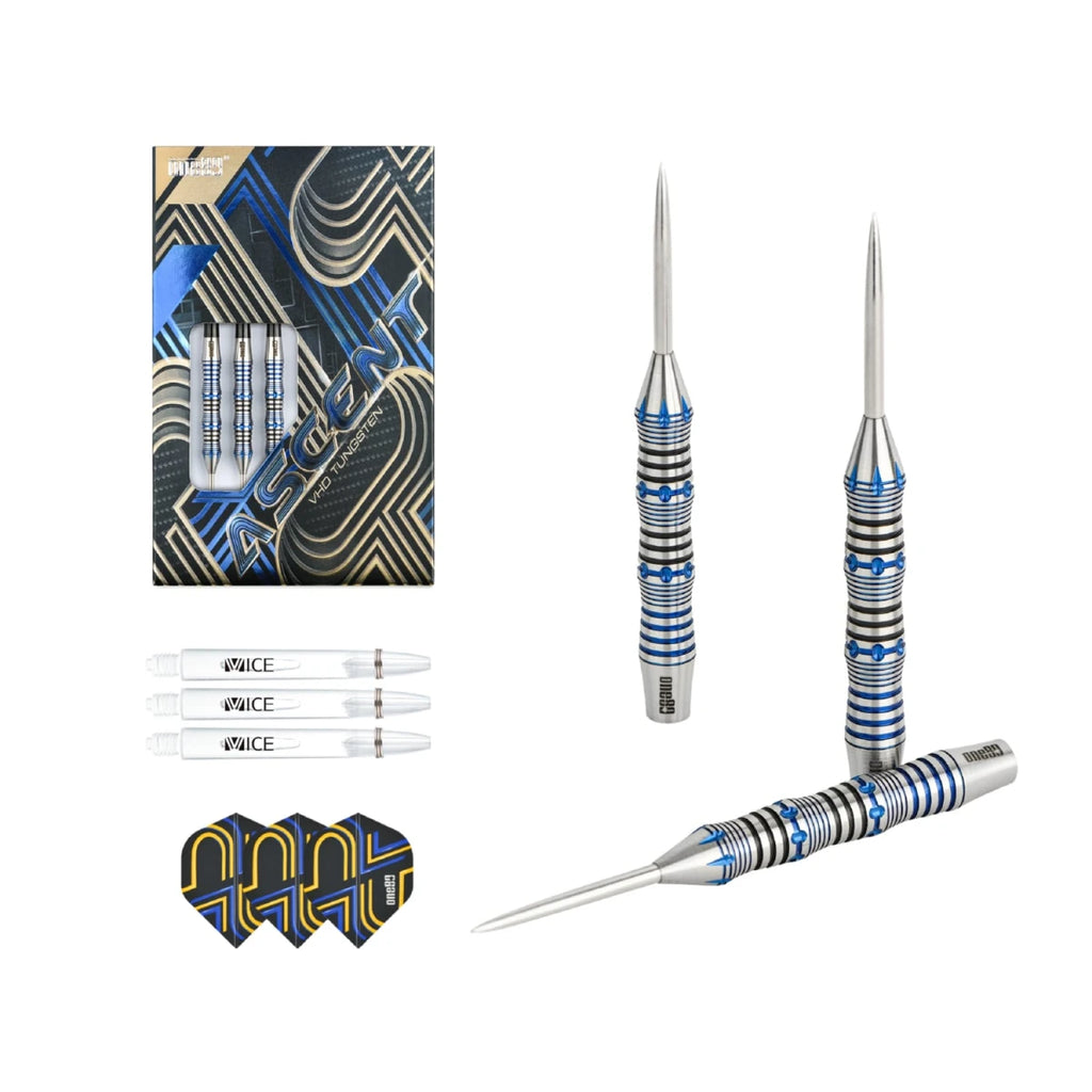 90 % Tungsten Barrel silber, blau, schwarz, Spitzen silber, Schäfte schwarz (Vice, 6 Stk.), Ascent Flights 7,2 mm x 50 mm (23 g), 7,5 mm x 50 mm (25 g) parallel leicht tapered mit drei griffmulden mit verschiedenen Gripzonen und -arten