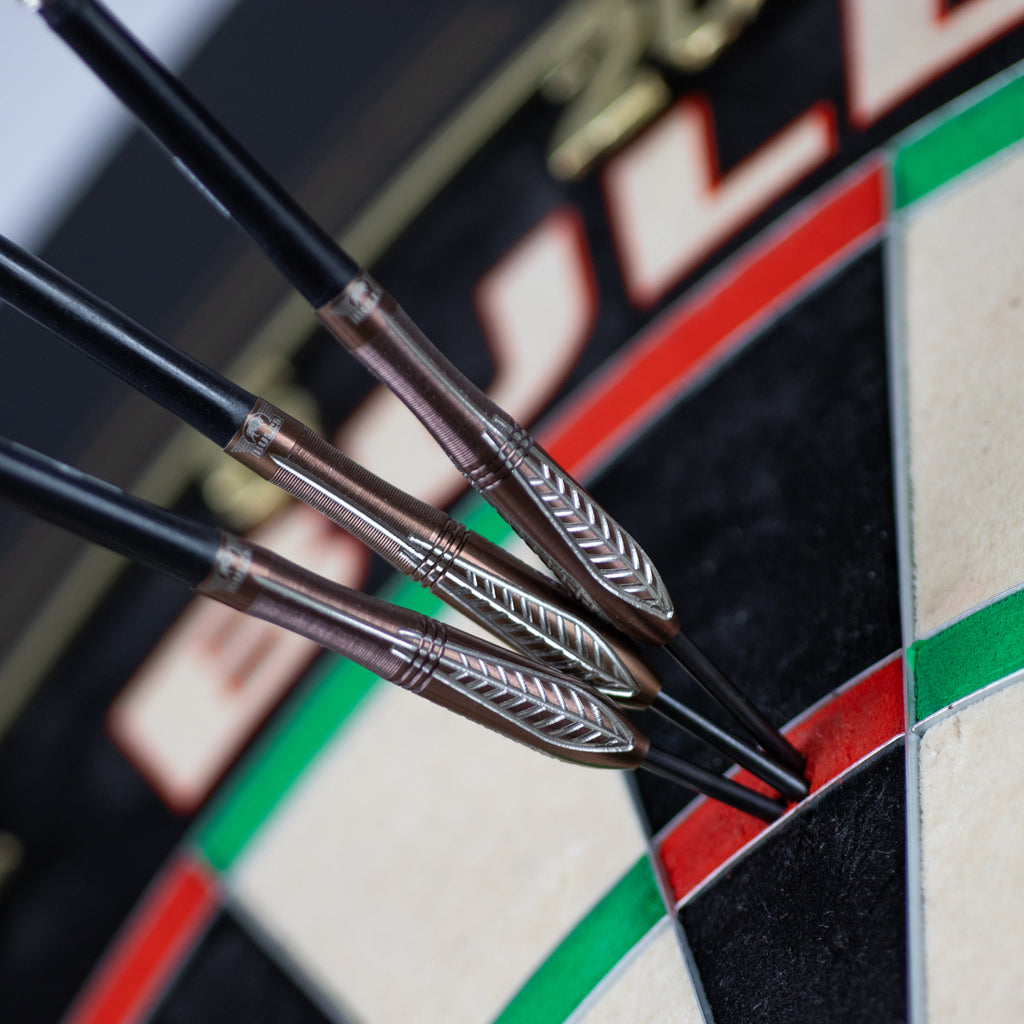 Die Fräsungen im vorderen Bereich dienen der Orientierung, bieten jedoch eher wenig Halt. Die Flux Variante ist in 22 und 24 Gramm erhältlich und ausgestattet mit Signature No.2 Flights und Medium Polycarbonat Schäften in schwarz.