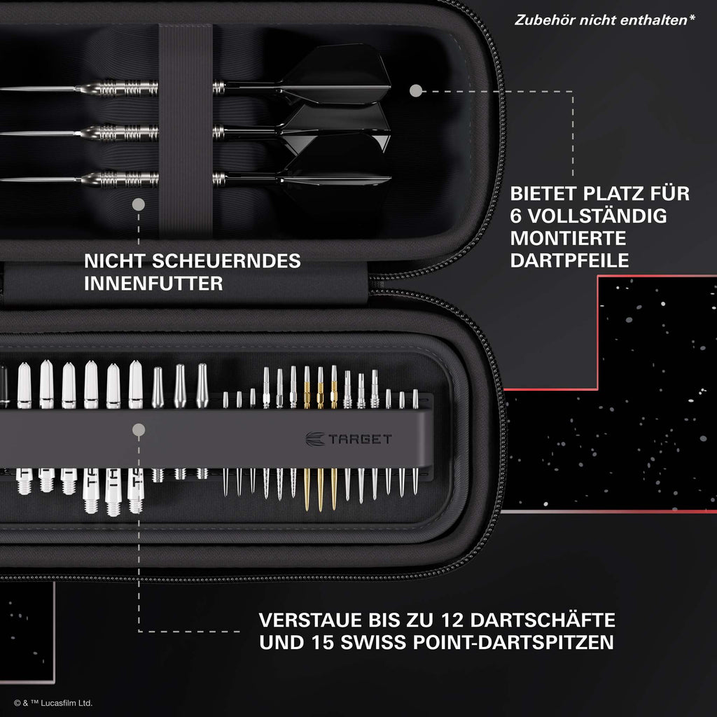 Im unverkennbaren rot-schwarzen Darth Maul Design bietet die Tasche Platz für bis zu sechs vollständig montierte Darts mit integrierten Flights & Schäften. Zusätzlicher Stauraum für Flights, Spitzen und Zubehör sorgt für echten Komfort.