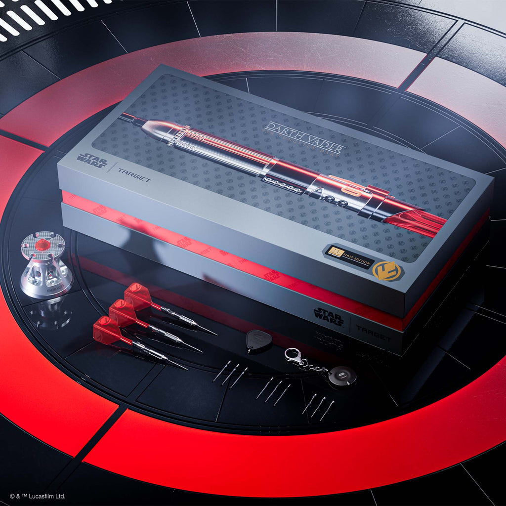 Zur Feier dieses offiziellen Releases enthält jedes Set außerdem einen Premium Darth Vader Laserschwert Dartständer, damit Fans ihre Darts mit der verdienten Wertschätzung präsentieren können.