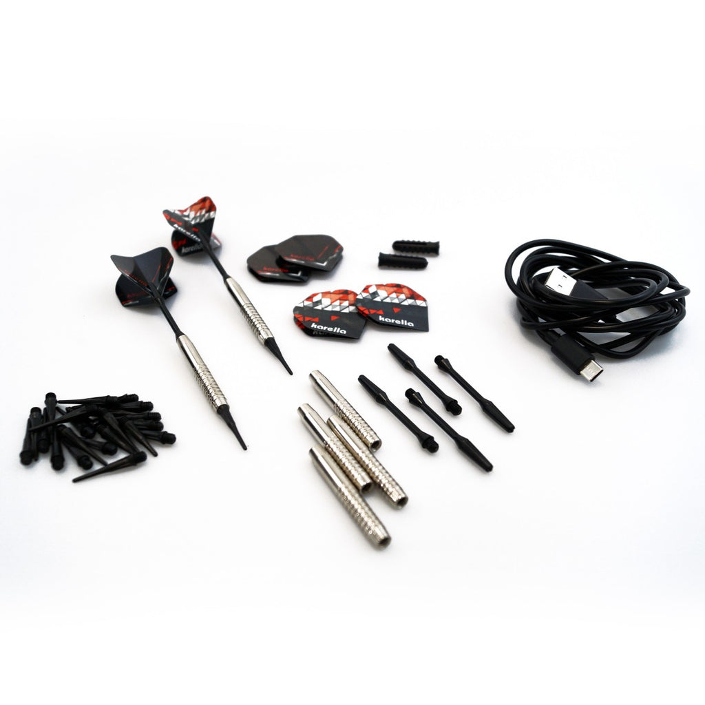 Lieferumfang: 6 Softdarts (jeweils ca. 15 g), Ersatzspitzen, 2 m langes Anschlusskabel (UBS-A / USB-C) und Montagematerial; Netzteil und Batterien sind nicht im Lieferumfang enthalten.