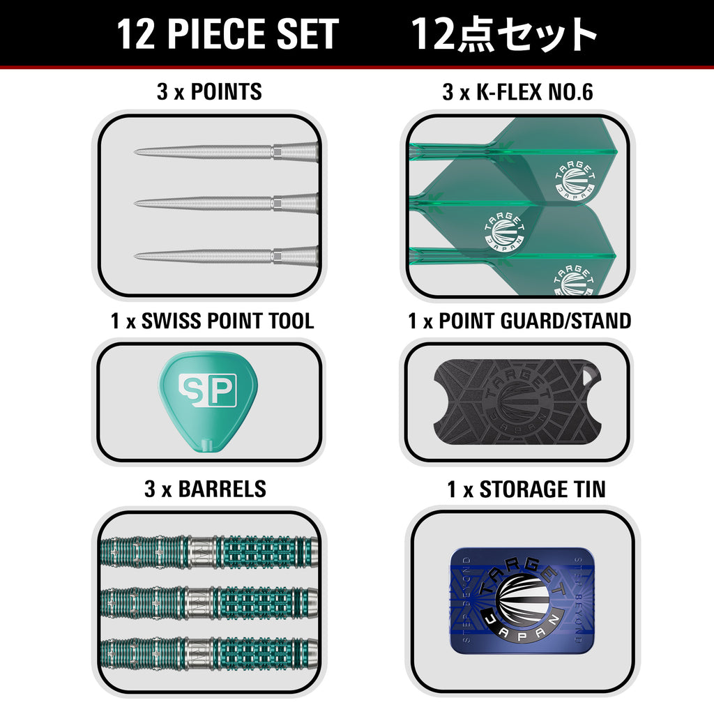 Abgerundet wird das in einer edlen Target Japan Metallbox aufbewahrte Set durch Swiss Nano Storm Points in 30mm Länge und No.2 intermediate K-Flex passend in grün mit Target Japan Logo und dem passenden grünen SwissPoint Tool.