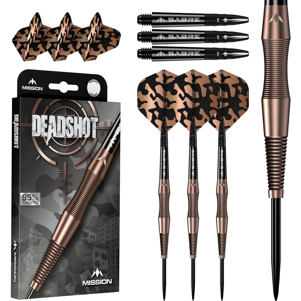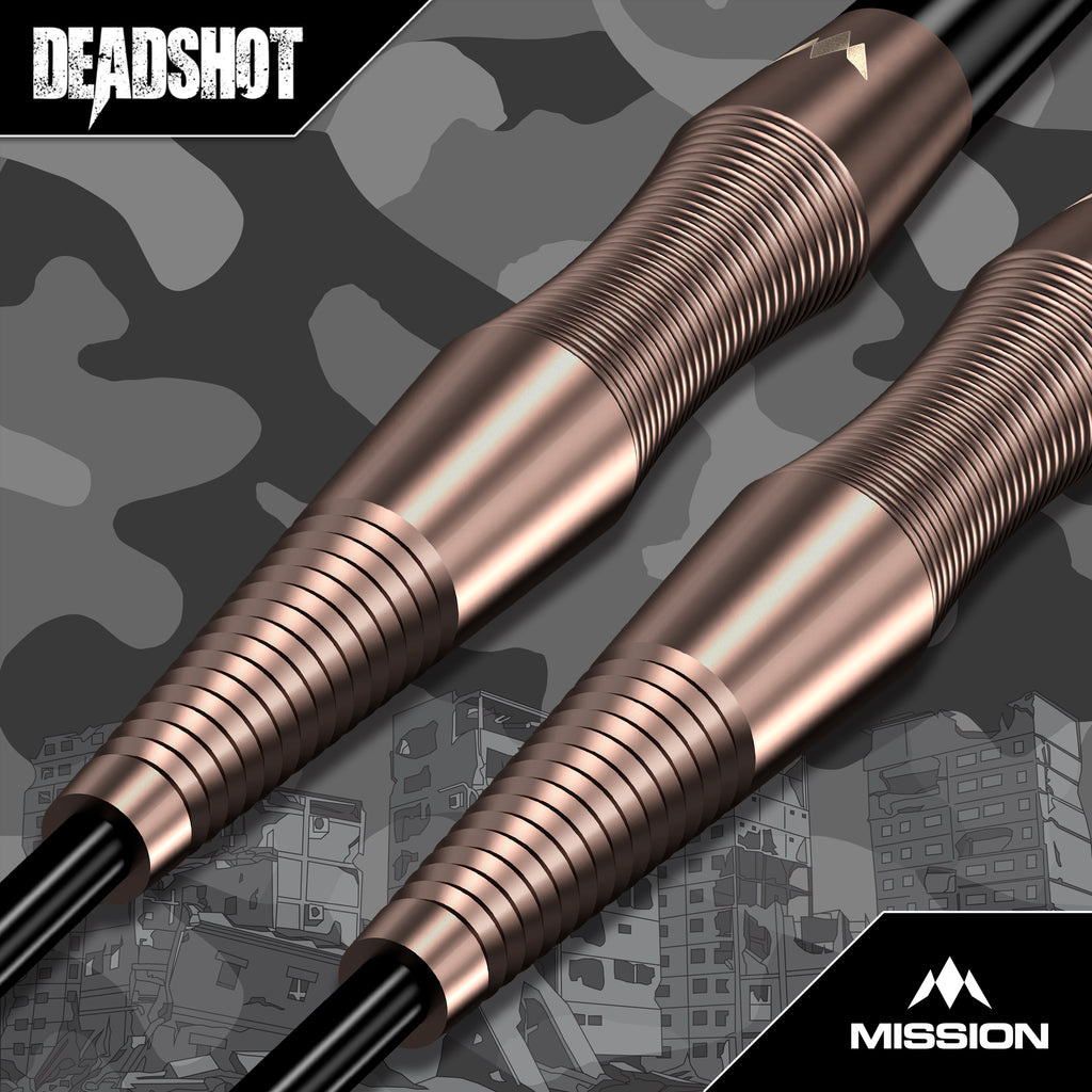 Wer sich bei den Deadshot an die Connor Scutt Darts erinnert fühlt, hat wahrscheinlich nicht ganz unrecht. Die Deadshot in bronzefarbener Beschichtung und mit einem sehr hoher 95% Tungsten Anteil kommen mit einer ausgeprägten Griffmulde, die mit richtig gutem Grip versehen ist, daher. Zusätzlich hat Mission im vorderen Bereich nochmal viel Grip zusätzlich verbaut, so dass kein Finder mehr abrutschen kann.