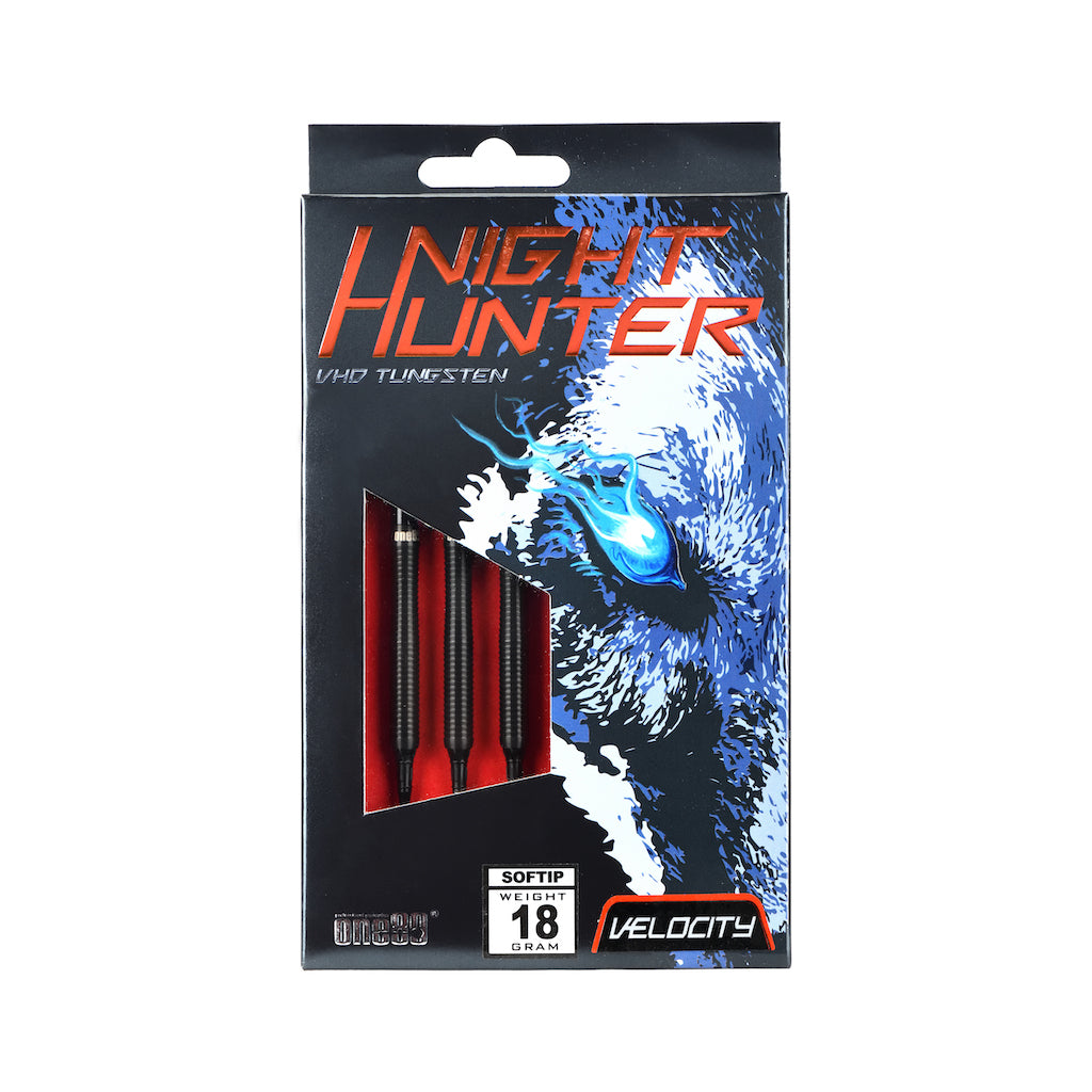 Die Night Hunter Serie aus dem Hause One80 kommen mit schwarzen Titanium-Nitrid Überzug, dunkelblauen Vice Schäften und speziell für diese Serie designten Flights.