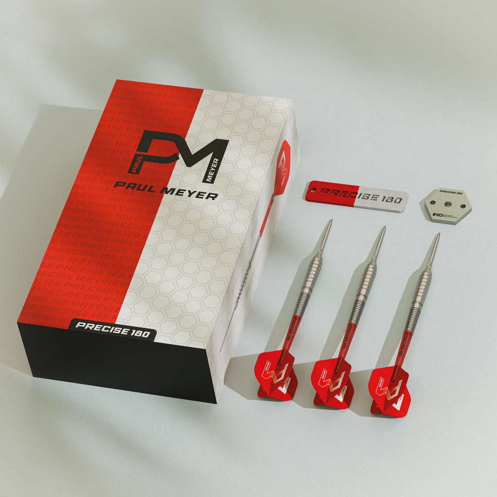 Der Paul Meyer Steeldart wurde - wie der Name schon sagt - in Zusammenarbeit mit dem deutschen Streamer Paul Meyer entwickelt. Das leicht tropfenförmige Barrel ist kopflastig, aus 90 % Tungsten gefertigt und verfügt über einen 2-Zonen-Grip. Die 32 mm Precise180 NoLip Caliburn Points lassen sich dank des Caliburn EVO Systems in Sekundenschnelle wechseln.