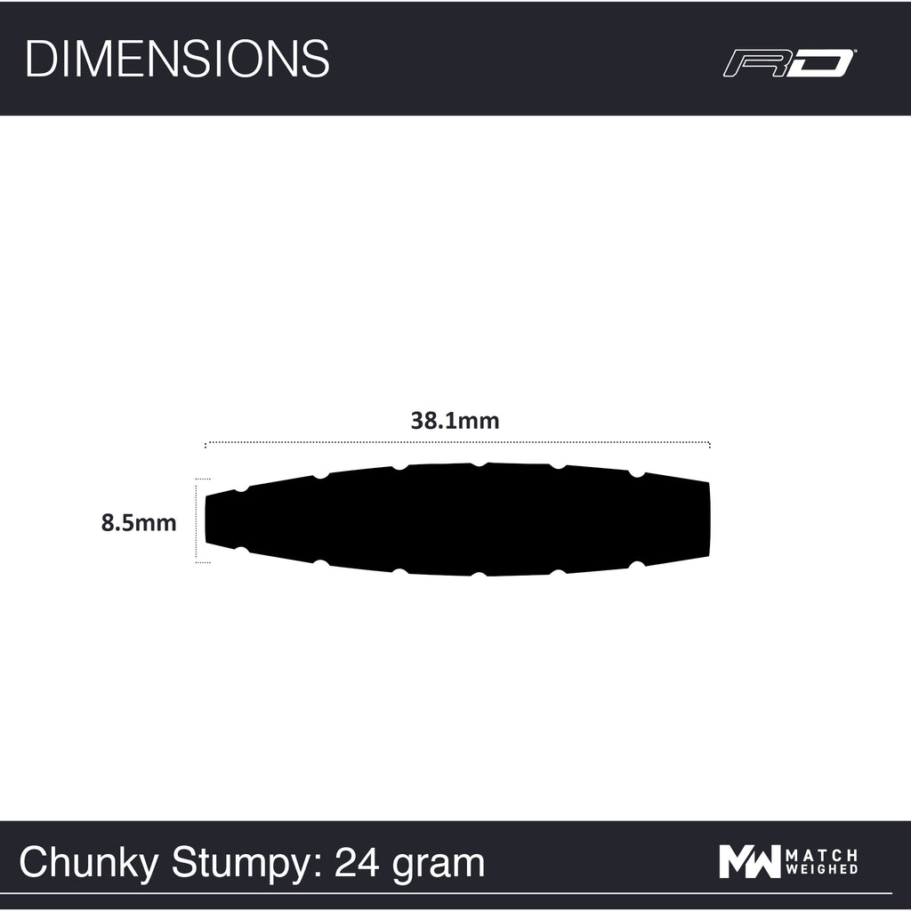 Die Chunky Stumpy sind aus 85% Tungsten gefertigt, kopflastige kurze Darts mit leichtem bis mittleren Grip und einem tappered (nach vorn und hinten schlanker werdend) Profil.
