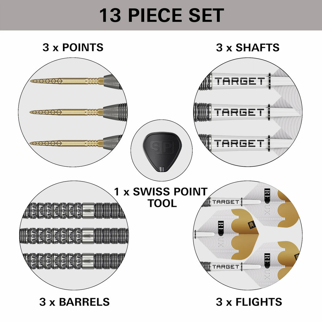 Der Target Redux 01 90% Tungsten Steeldart ist die Tapered Variante aus der Target High-End Non-Player Redux Range. Der einzigartige Pixelgrip der Redux-Serie in der vorderen Barrel-Hälfte wird im hinteren Dart-Drittel durch feinen Ringgrip ergänzt. Diese Kombination schafft eine angenehme Haptik mit einem ausgewogenen Gripniveau. Das grau-schwarze Barrel ist mit goldenen Spitzen und weiß-goldenem Shafts und Flights zusammengestellt, was den edlen Redux-Look schafft und den Dart zu einem echten Hingucker macht.
