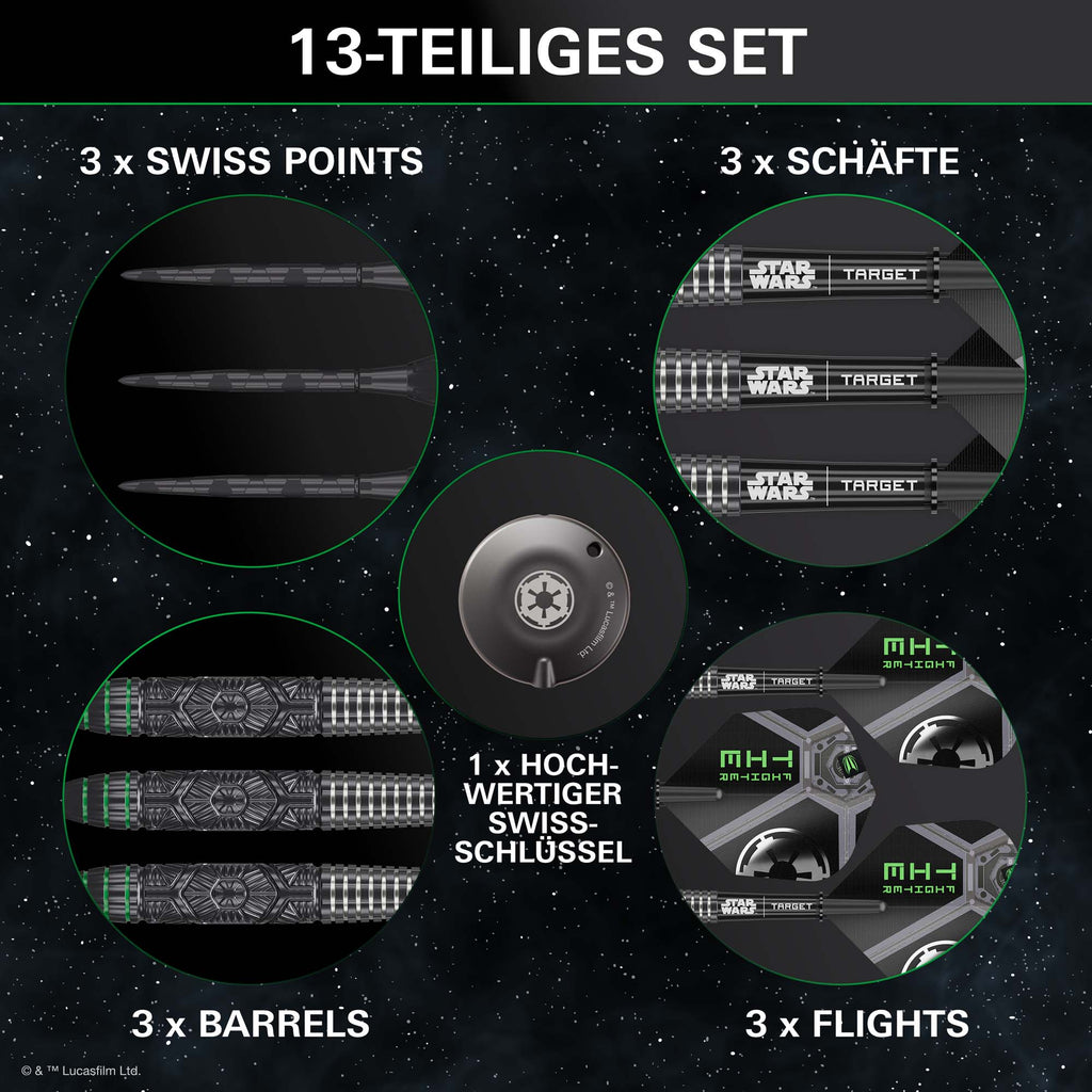 Das Design setzt sich fort mit offiziellen Star Wars Pro Grip-Schäften, die Targets leichte, schlagfeste Polymermischung mit einer markanten imperialen Ästhetik kombinieren. In Kombination mit Pro Ultra No. 6 Flights im Tie-Fighter-Artwork, entsteht ein Setup mit aerodynamischer Stabilität und eindrucksvoller Präsenz am Board.