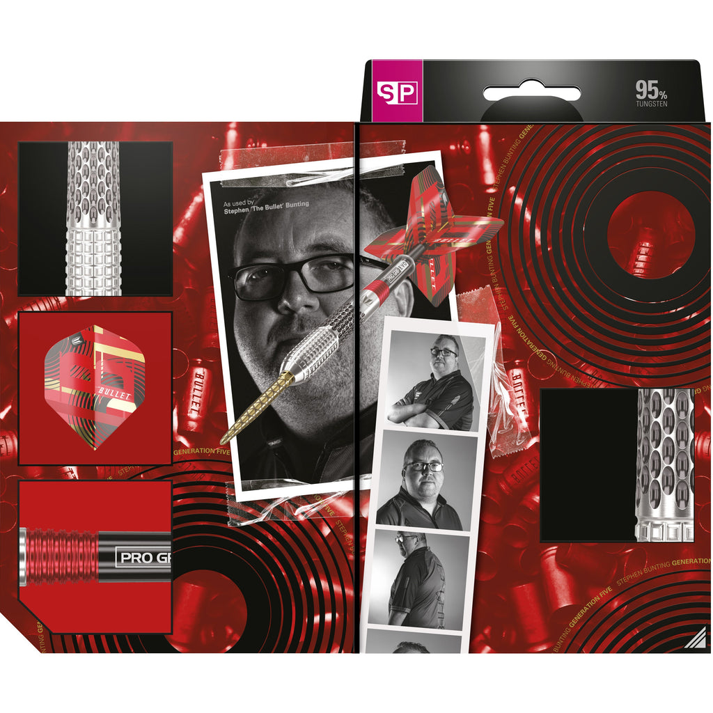 Die 5. Generation des Stephen Bunting Darts ist da. Leicht frontlastig mit sehr angenehmem Axialgrip im vorderen Bereich ergänzt um leichten Grip im hinteren Bereich des Barrels. Aufgrund des höheren Tungsten Anteils ist der Spielerdart von "The Bullet" nochmals schlanker geworden.