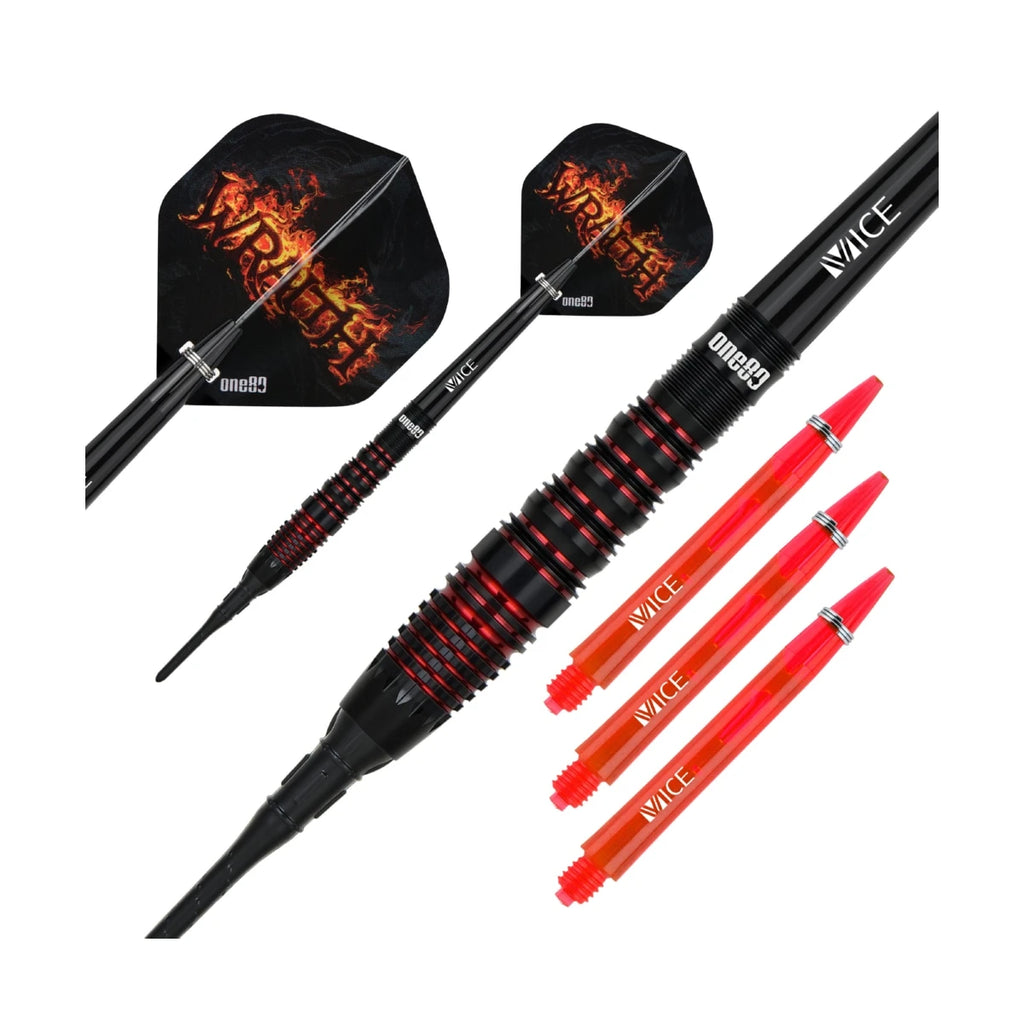 Die neue Wraith Serie von one80 bietet 4 verschiedene Barrelformen, alle mit toller schwarz-roter Beschichtung, je einem Satz schwarzer und einem Satz roter Schäfte, sowie den dazu passenden Signature Flights.